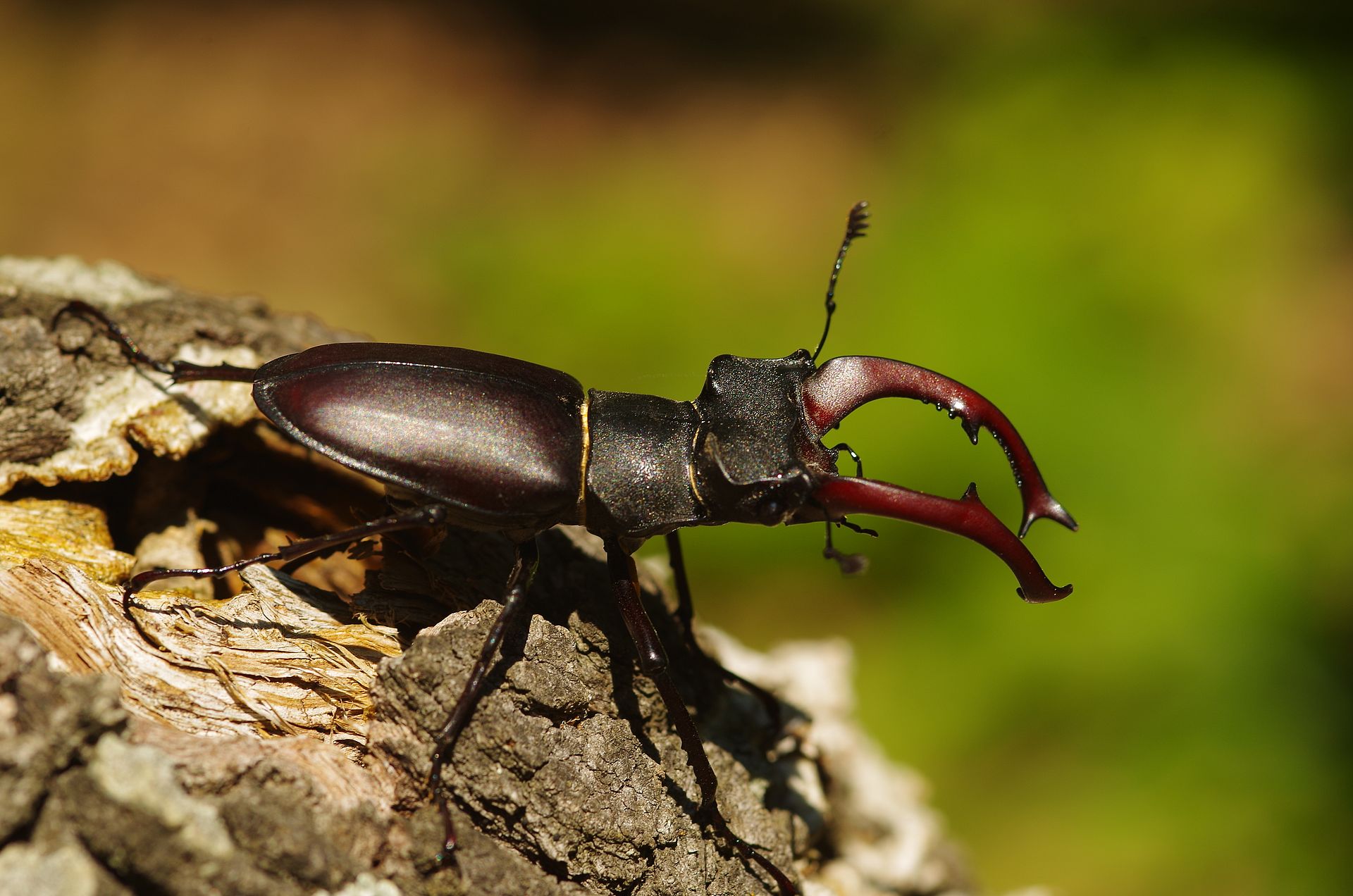 Mit seinem prächtigen Geweih wirkt der Hirschkäfer majestätisch, wie sein Namensvetter der Rothirsch. Leider sind Hirschkäfer in den letzten Jahrzehnten seltener geworden. Engagierte Forstleute unterstützen bereits seit den 90er Jahren den Hirschkäfer mit sogenannten Hirschkäfermeilern. Dazu werden Eichenrundlinge, wie hier, in den Boden eingegraben. Dies unterstützt das natürliche Brutangebot an Laubtotholz mit Bodenkontakt– ähnlich ein Nistkasten für Vögel.