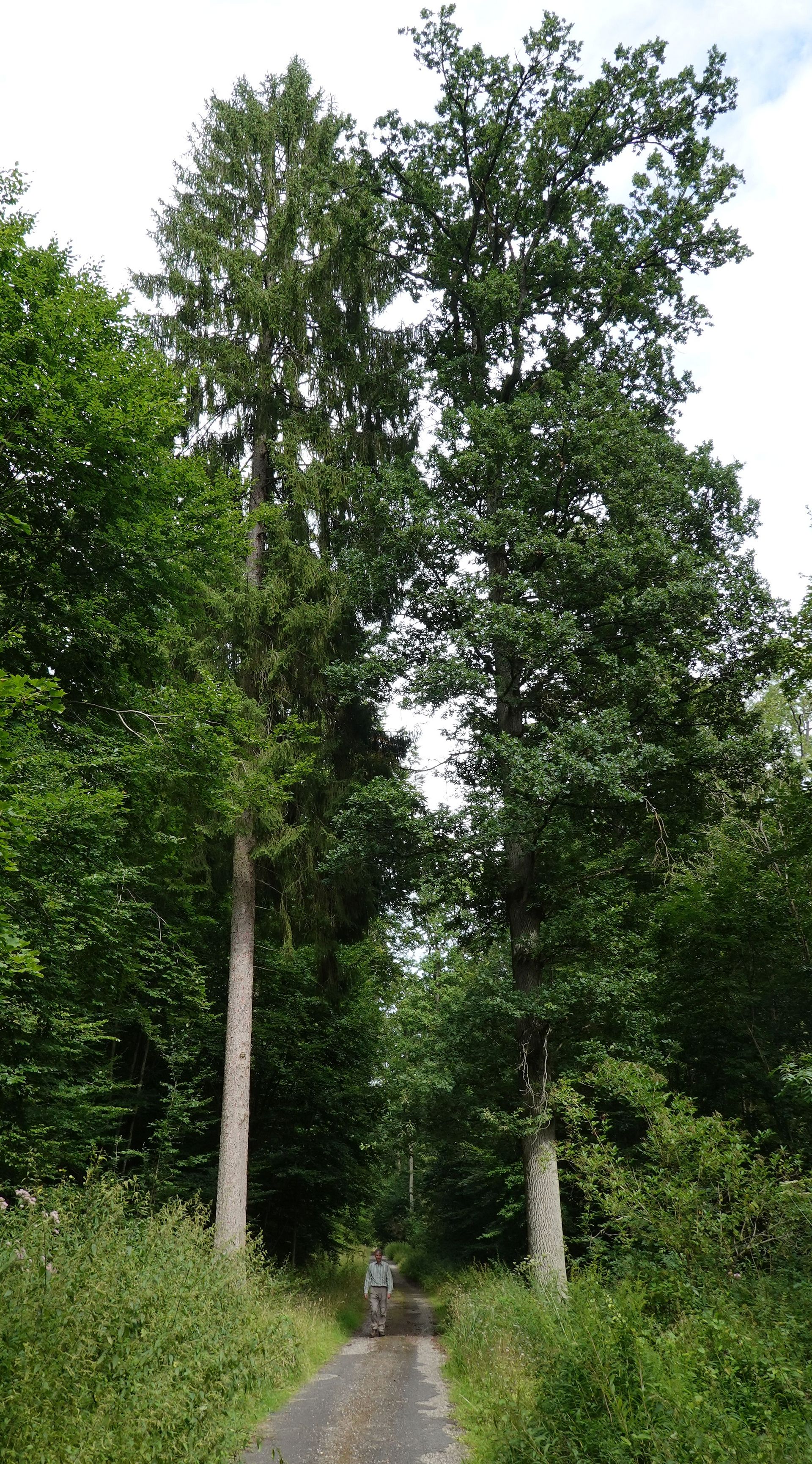 Von unten, aus dem Wald kommend, erscheinen die beiden Bäume eher unscheinbar. Wechselt man jedoch die Perspektive, erscheinen die Fichte und Eiche wie zwei Wächter links und rechts von einem Tor.