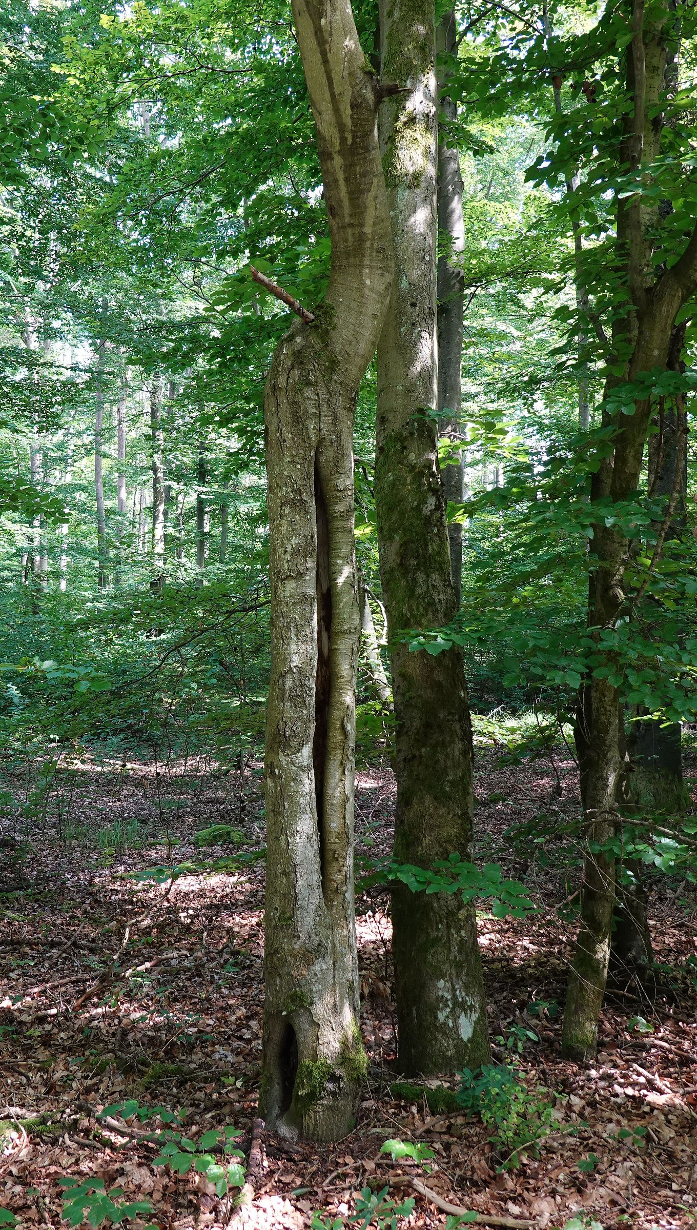 An dieser Stelle steht am rechten Wegrand eine Buche mit bizarrem Wuchs: Ihr fehlt der Kern im Inneren des Baumes. Trotzdem wächst sie weiter und ist vital. Nehmen Sie sich einen Moment, um in das Innere zu sehen, den Baum abzuklopfen oder durch den Baum gen Himmel zu schauen.