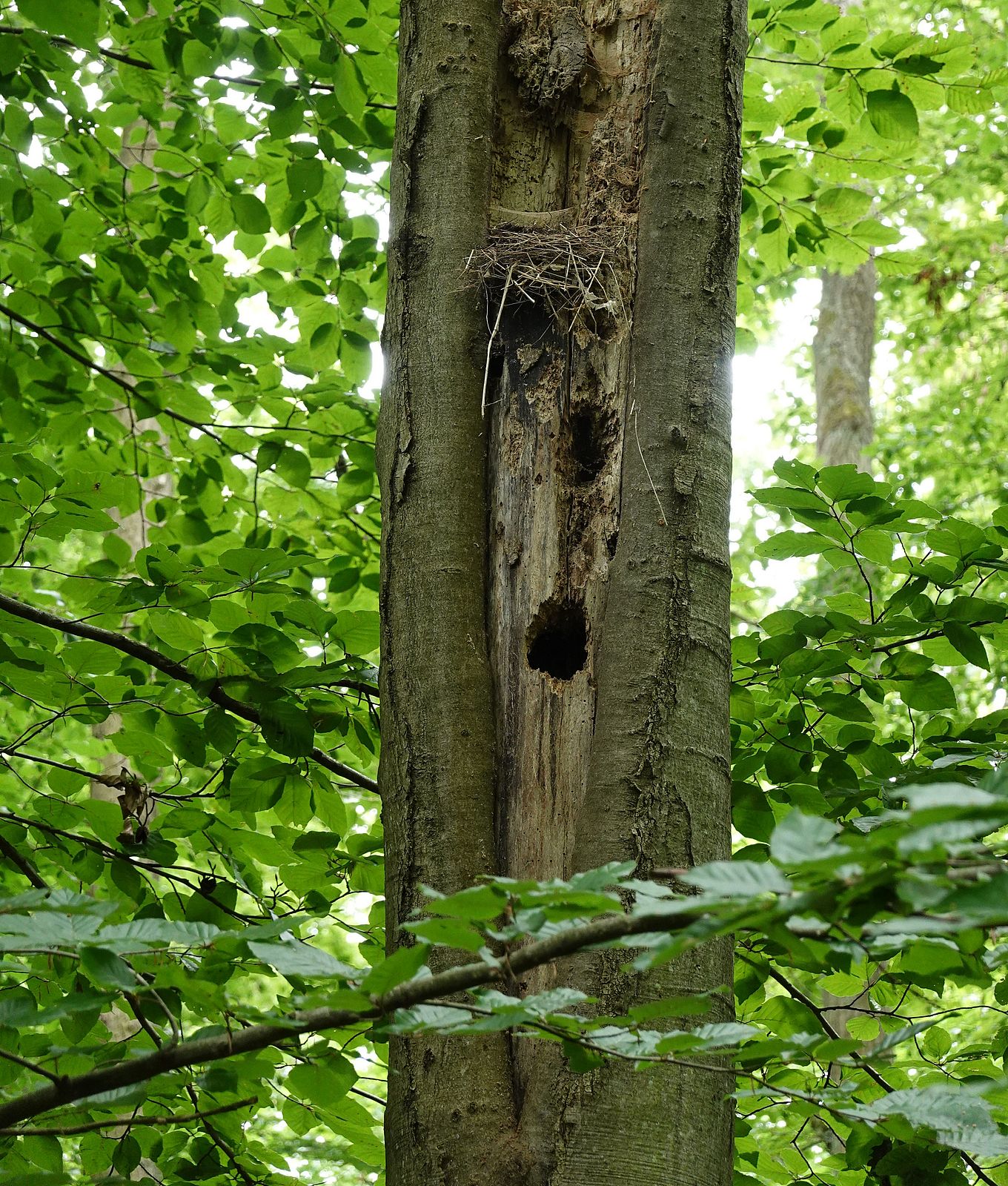 Vor Jahren, als der Wald noch bewirtschaftet wurde, hat der Specht hier bereits seine Höhle in den Baum gezimmert, um darin seine Jungen groß zu ziehen. Im Frühsommer lassen sich die fleißigen Eltern beobachten, wie sie im Minutentakt Futter bringen. Aber bitte Abstand halten, um sie nicht zu stören.